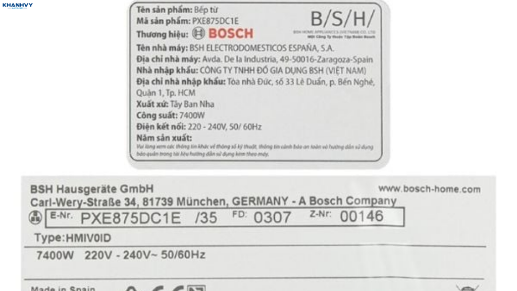 Mỗi sản phẩm bếp từ Bosch chính hãng đều được dán tem nhãn rõ ràng thể hiện xuất xứ sản phẩm. Trên tem thường ghi thông tin như “Made in Germany” (Sản xuất tại Đức), “Made in Spain” (Sản xuất tại Tây Ban Nha) hoặc “Made in China” (Sản xuất tại Trung Quốc). Người dùng cần kiểm tra kỹ phần tem nhãn này, thường nằm ở đáy hoặc mặt sau của bếp và trên bao bì hộp sản phẩm.