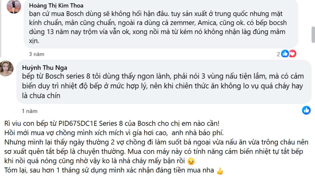 Điều này giúp bạn có cái nhìn khách quan về chất lượng sản phẩm và dịch vụ mua hàng từ đơn vị đó. Dưới đây là các đánh giá từ các khách hàng đã trải nghiệm sản phẩm bếp từ Bosch tại hội nhóm Cộng đồng người dùng bếp từ Việt Nam.