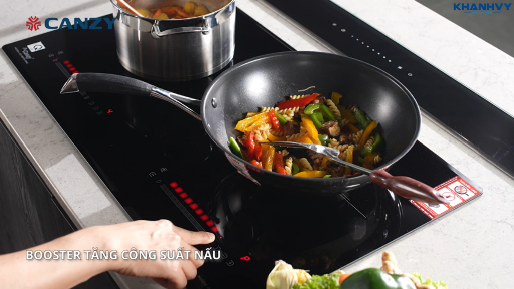 Chức năng Booster (Nấu nhanh): Khi cần đun sôi nước hoặc làm nóng chảo để chiên xào nhanh, chức năng Booster sẽ đẩy công suất của vùng nấu lên mức cực đại (thường gấp 1.3 - 1.5 lần công suất tối đa) trong một khoảng thời gian ngắn (khoảng 5-10 phút). Tính năng này giúp rút ngắn đáng kể thời gian nấu nướng, đặc biệt hữu ích trong cuộc sống bận rộn.