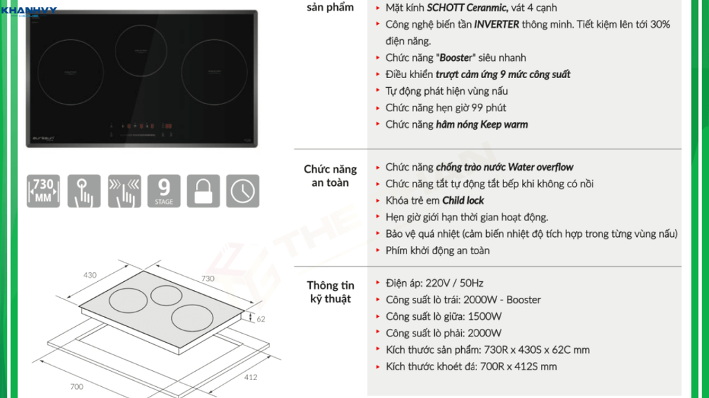 Ngoài ra, đọc kỹ thông số kỹ thuật sản phẩm cũng giúp bạn xác định xem bếp có công nghệ biến tần hay không. Thông thường, những bếp có hiệu suất tiết kiệm điện cao, dải công suất linh hoạt và chức năng Booster sẽ áp dụng công nghệ Inverter.