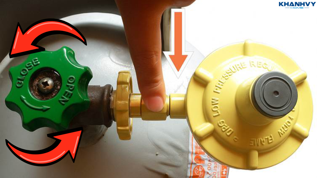 Ngay sau khi đã tắt lửa trên bếp, hãy di chuyển đến vị trí bình gas và xoay núm vặn trên van gas theo chiều kim đồng hồ (hoặc theo chiều mũi tên "CLOSE") cho đến khi chặt tay. Đây là bước then chốt để ngắt hoàn toàn nguồn cung cấp gas từ bình.