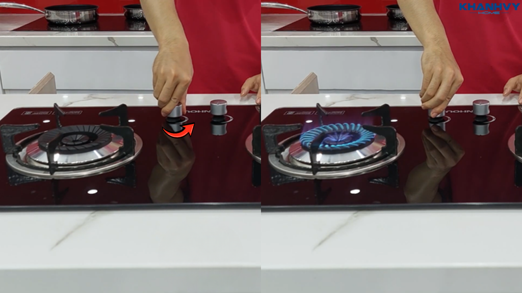 Dùng tay ấn nhẹ núm vặn của vùng nấu bạn muốn sử dụng xuống khoảng 1-2 giây, sau đó xoay ngược chiều kim đồng hồ cho đến khi nghe tiếng "tách" của bộ phận đánh lửa. Hệ thống đánh lửa (Magneto hoặc IC) sẽ tạo ra tia lửa để đốt cháy khí gas.