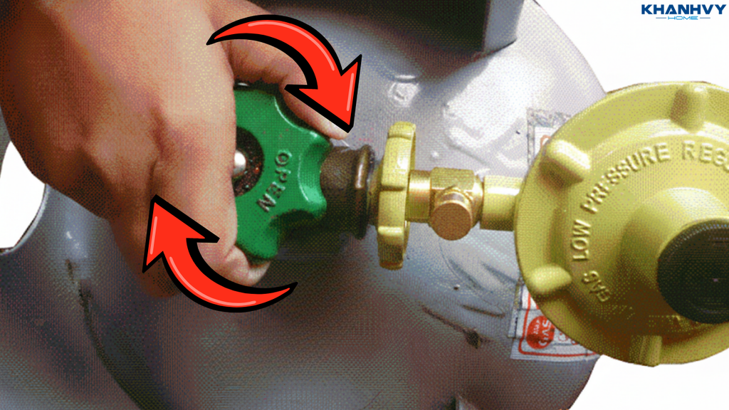 Vặn van ở đầu bình gas cùng chiều với chiều quay của kim đồng hồ để khóa gas