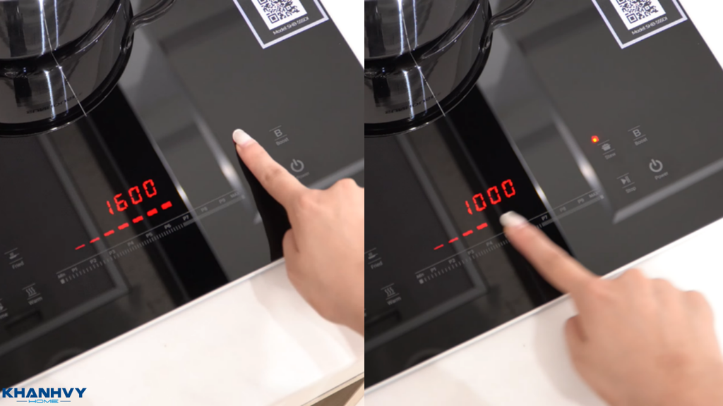 Bước 2: Chọn vùng nấu và điều chỉnh công suất: Chạm vào biểu tượng của vùng nấu hoặc chức năng bạn muốn sử dụng, sau đó dùng thanh trượt cảm ứng (Slider) hoặc các nút "+"/"-" để tăng giảm mức công suất/nhiệt độ.