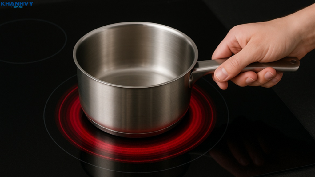 Nhấc dụng cụ nấu lên và đặt lại một cách cẩn thận, đảm bảo đáy nồi nằm ngay ngắn và cân đối ở chính giữa vòng tròn vùng nấu.