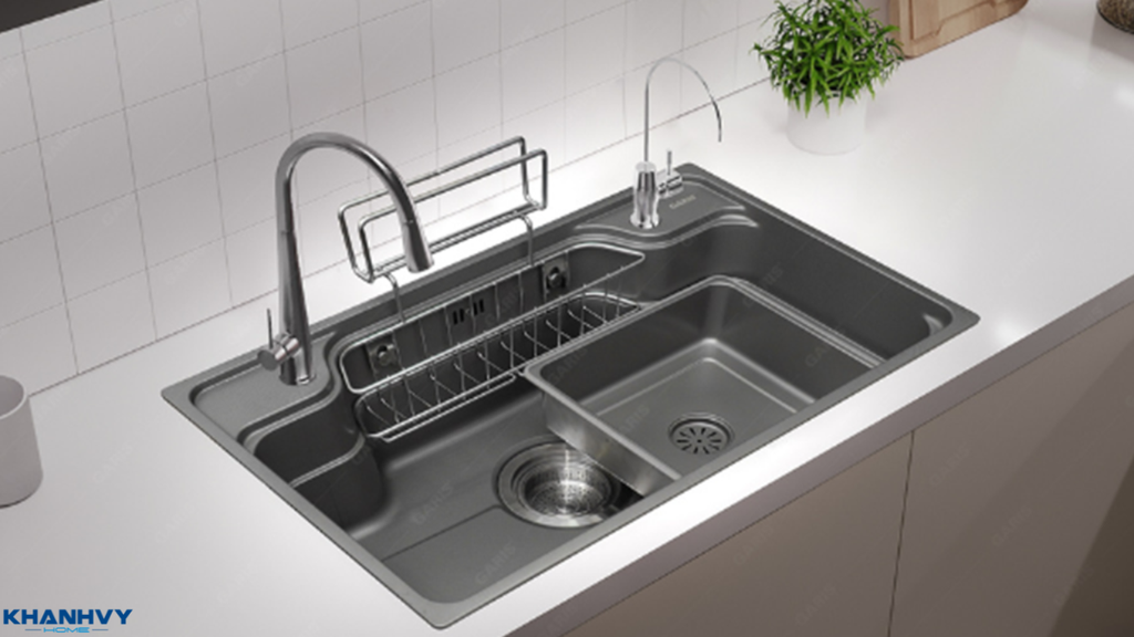 Thẩm mỹ đỉnh cao: Với nhiều màu sắc đa dạng (đen, xám, trắng, kem...), chậu đá Granite dễ dàng phối hợp với mọi phong cách tủ bếp và mặt đá, mang lại vẻ đẹp liền khối và tinh tế.