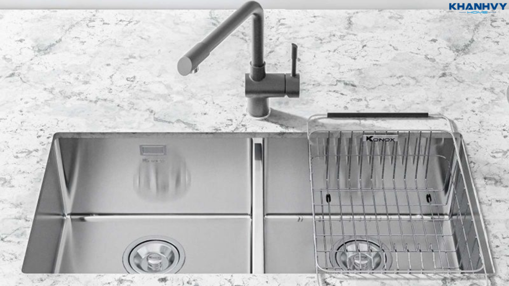 Công nghệ: Bề mặt được xử lý chống ồn, giảm thiểu tiếng động khi xả nước. Tích hợp hệ thống chống tràn và bộ lọc rác hiệu quả, ngăn tắc nghẽn và giữ cho bếp luôn khô ráo, sạch sẽ.
