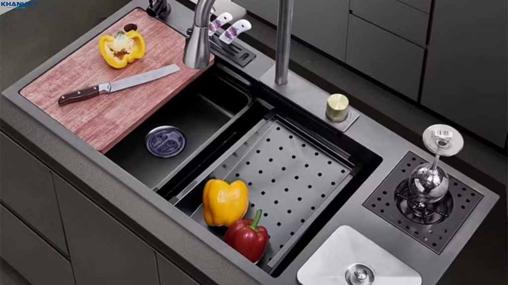Phụ kiện chậu rửa chén thông minh bao gồm các thiết bị và vật dụng tích hợp trực tiếp vào chậu rửa nhằm nâng cao chức năng, sự tiện nghi và hiệu quả sử dụng. Chúng gồm vòi nước điều chỉnh nhiệt độ, màn hình hiển thị nhiệt độ nước, bộ lọc xả nước, rổ lọc rác, giá để chai lọ gia vị dao thớt, thậm chí cả máy xay thực phẩm tích hợp. Những phụ kiện này giúp tối ưu hóa không gian bếp tiết kiệm thời gian và công sức cho người sử dụng.