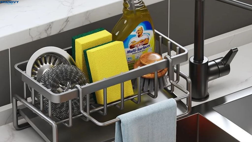 Giá để dụng cụ rửa chén là phụ kiện giúp sắp xếp gọn gàng các vật dụng như bọt biển, khăn rửa và nước rửa chén đúng vị trí, tránh để rơi rớt hoặc làm bừa bộn khu vực bồn rửa. Sản phẩm đa dạng về kiểu dáng và kích thước, có thể đặt trên thành chậu hoặc gắn tường tùy theo không gian bếp.