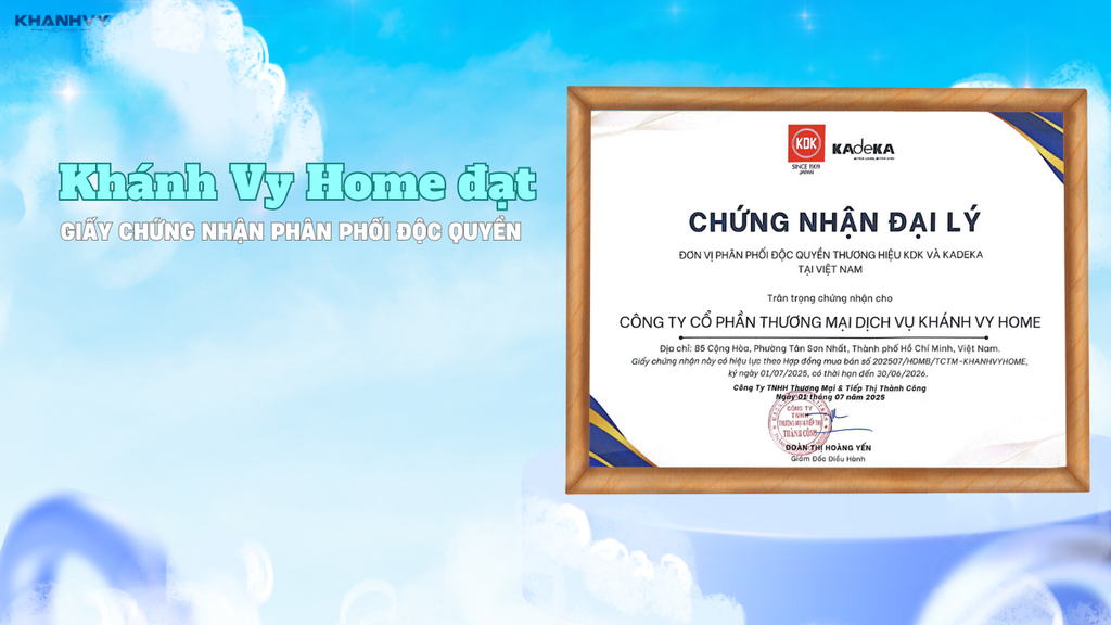 Chứng nhận đại lý độc quyền là minh chứng rõ ràng cho vị thế và năng lực của Khánh Vy Home trong việc hợp tác cùng các thương hiệu quốc tế. Việc được KDK & Kadeka Japan tin tưởng lựa chọn cho thấy Khánh Vy Home đáp ứng đầy đủ các tiêu chí khắt khe về năng lực kinh doanh, quy trình dịch vụ và chuẩn mực đạo đức nghề nghiệp.
