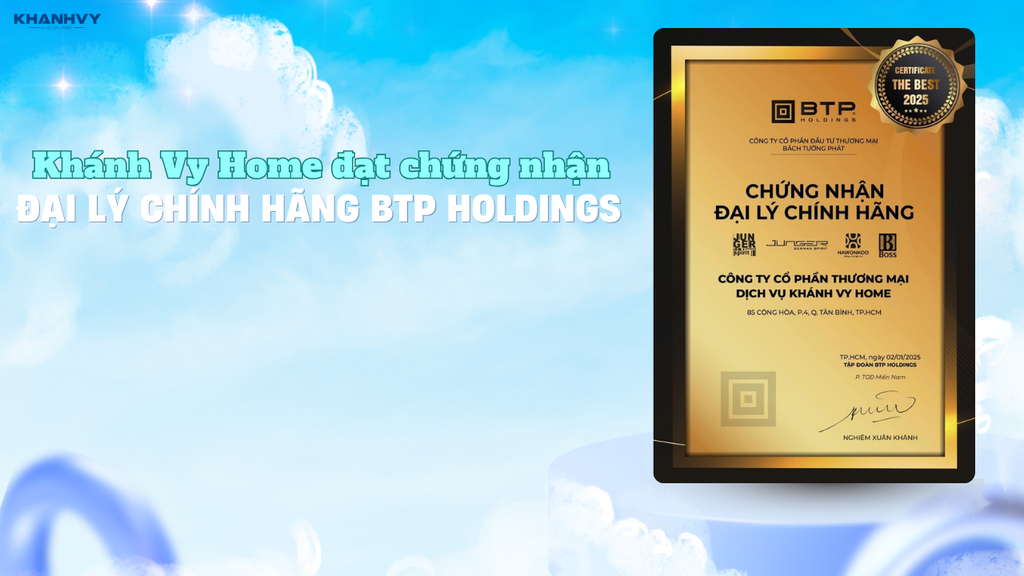 Khánh Vy Home chính thức trở thành đại lý chính hãng của BTP Holdings Việt Nam, tập đoàn sở hữu các thương hiệu thiết bị bếp và gia dụng nổi tiếng như Boss, Junger, Hawonkoo. Sự hợp tác này đánh dấu bước phát triển quan trọng trong hành trình mang đến cho khách hàng Việt những sản phẩm chất lượng, chính hãng và dịch vụ tận tâm.