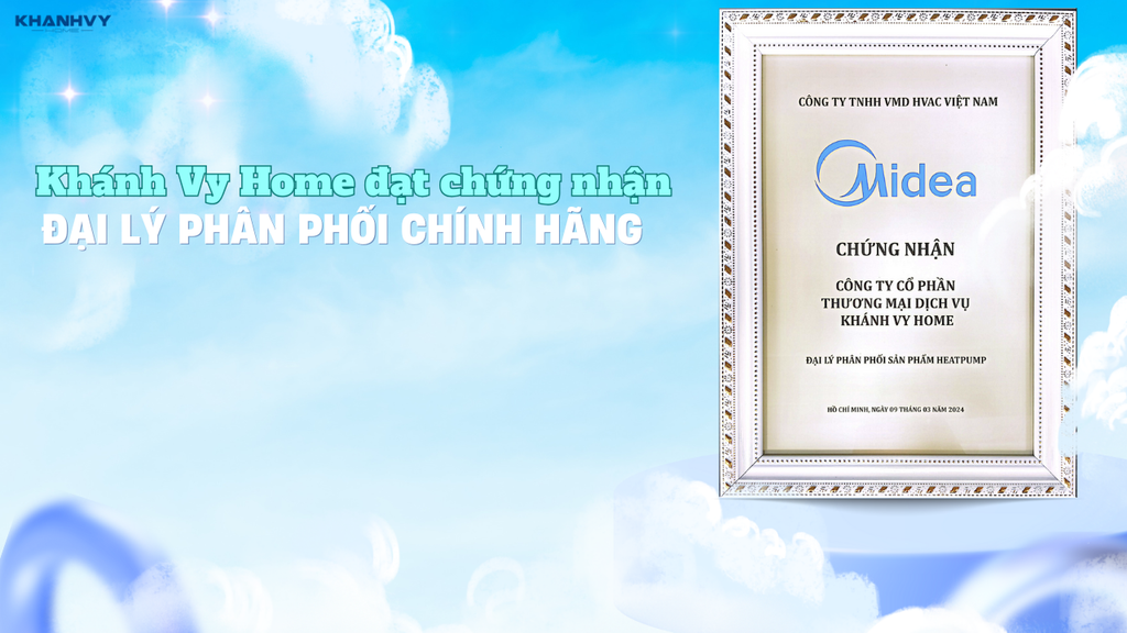 Ngày 09/03/2024, Công ty TNHH VMD HVAC Việt Nam đại diện phân phối của Midea Việt Nam đã cấp chứng nhận đại lý chính hãng cho Khánh Vy Home. Đây là cột mốc quan trọng, đánh dấu bước phát triển mới trong hành trình hợp tác chiến lược giữa hai thương hiệu lớn trong ngành thiết bị điện gia dụng và giải pháp nhiệt năng.