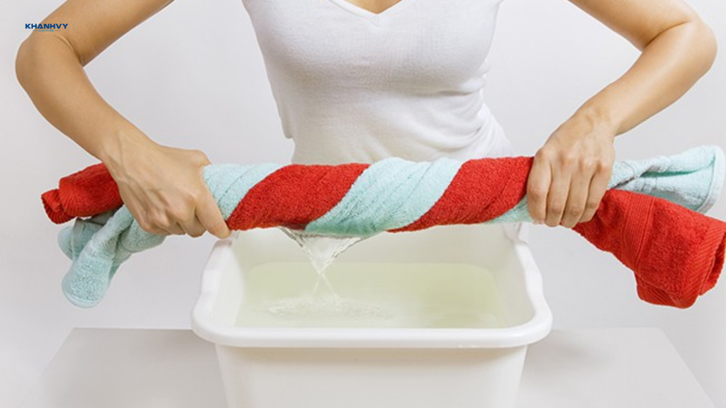 Cuối cùng, dùng sức vắt mạnh để khăn hút bớt nước trong sợi vải.