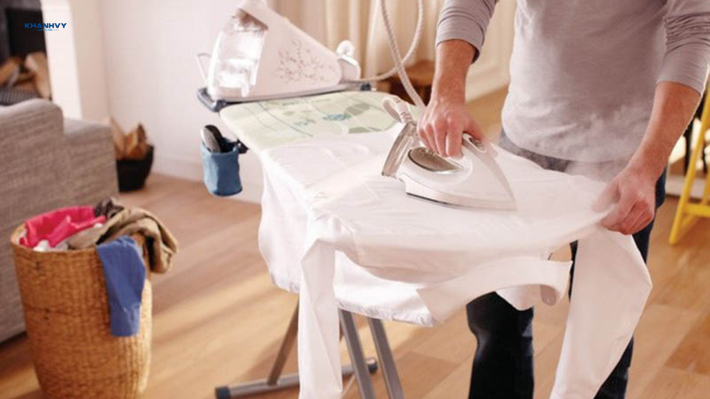 Sau khi vắt thật kỹ, hãy trải quần áo lên mặt phẳng và ủi đều tay. Hơi nóng từ bàn là giúp quần áo khô đi đáng kể, sau khi treo lên móc vài phút thì áo sẽ khô hoàn toàn và bạn có thể mặt ngay được. Lưu ý khi sử dụng bàn là, bạn cần chọn nhiệt độ phù hợp để tránh làm hỏng quần áo và thao tác cẩn thận để không bị bỏng.