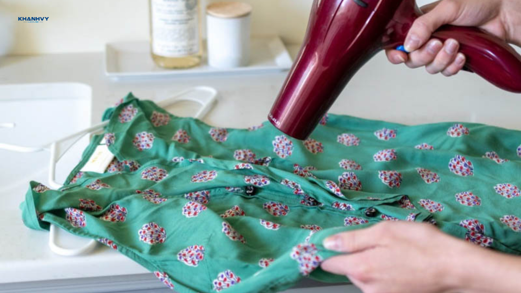 Bạn có thể Đặt máy sấy ở chế độ nhiệt vừa hoặc nóng và di chuyển đều quanh bề mặt vải. Một mẹo nhỏ khi sử dụng máy sấy tóc là cho quần áo vào túi ni-lông, cột chặt miệng túi và hướng luồng gió máy sấy vào trong. Cách này giúp tạo một “không gian sấy” khép kín, giúp quần áo khô đều và nhanh hơn.