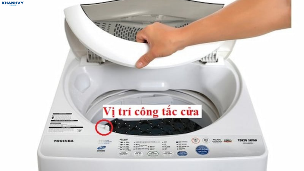 Bước 2: Mở nắp máy giặt, quan sát công tắc cửa xem có bị kẹt, hỏng hay mất nút bấm hay không. Nếu công tắc cửa bị hỏng, cần thay thế linh kiện mới đúng loại phù hợp với máy.
