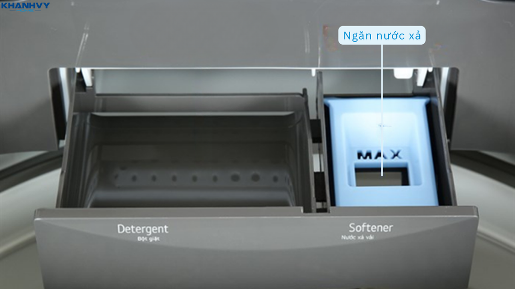 Đối với máy giặt LG cửa trước, ngăn chứa này là một phần của khay đựng chất giặt tẩy lớn, thường được đặt ở góc trên bên trái của máy. Bạn chỉ cần kéo khay này ra là sẽ thấy các ngăn được phân chia rõ ràng.