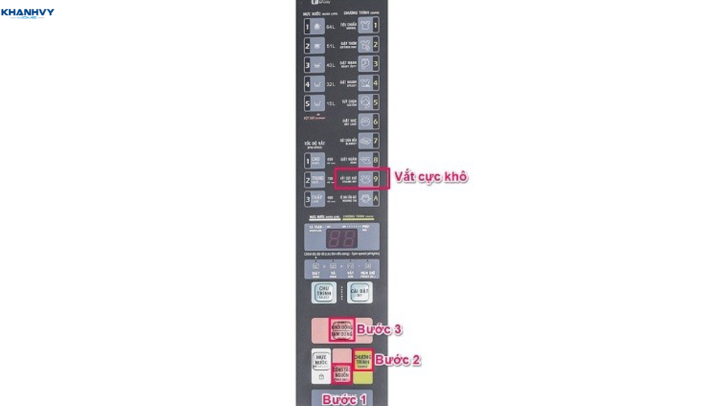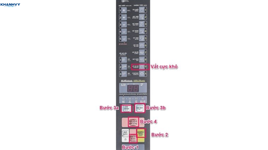 Bước 1: Nhấn công tắc nguồn để mở máy giặt. Bước 2: Bấm nút Chương trình liên tục cho đến khi đèn sáng tại chế độ Vắt cực khô. Bước 3: Nhấn nút Khởi động/Tạm dừng để bắt đầu chu trình vắt cực khô.