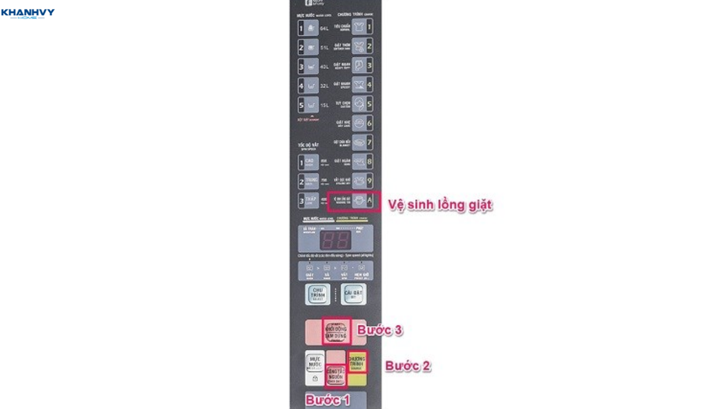 Bước 1: Nhấn công tắc nguồn để mở máy. Bước 2: Nhấn nút Chương trình 9 lần để chọn chương trình vệ sinh lồng giặt. Bước 3: Nhấn nút Khởi động/Tạm dừng để bắt đầu chu trình vệ sinh.