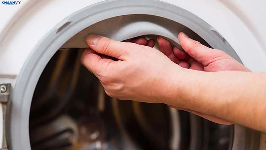 Bước 5: Lau kỹ phần gioăng cao su quanh cửa máy giặt để làm sạch nấm mốc và bụi bẩn.