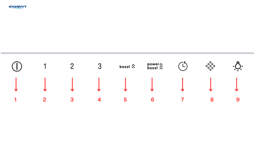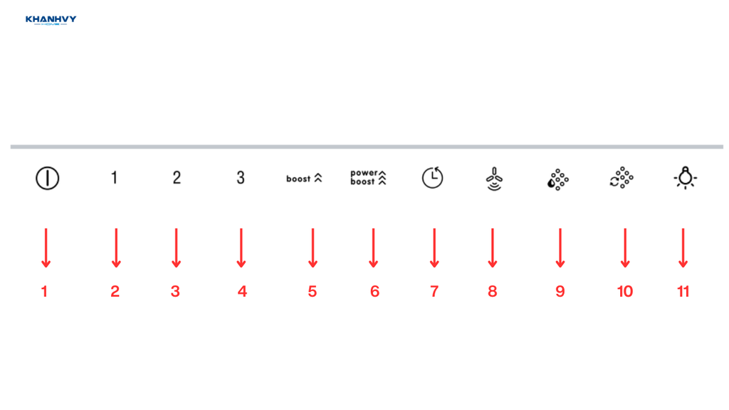 Số 1: Nút nguồn để bật và tắt máy hút mùi.