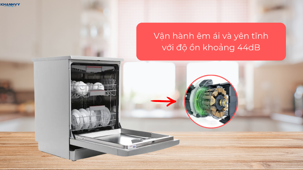 Bosch SMS46MI05E vận hành êm ái với mức độ ồn chỉ khoảng 44 dB, tương đương tiếng nói thì thầm, không gây ảnh hưởng đến sinh hoạt gia đình. Ở chế độ rửa ban đêm (Silence), tiếng ồn còn giảm xuống khoảng 42 dB, rất nhẹ nhàng. Động cơ EcoSilence Drive không chổi than góp phần giảm rung lắc và tiếng ồn, đảm bảo máy vận hành ổn định và yên tĩnh, phù hợp với không gian sống hiện đại yêu cầu sự yên tĩnh, đặc biệt khi nhà có người già và trẻ nhỏ.