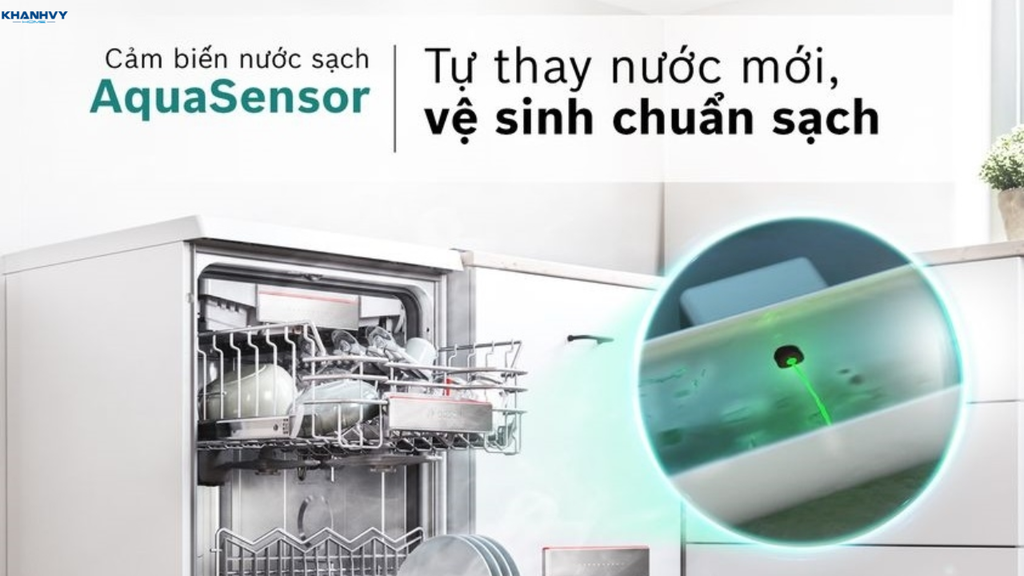 Kết hợp với đó, công nghệ AquaSensor sử dụng cảm biến quang học để đánh giá độ sạch của nước thải sau mỗi chu trình rửa. Dựa trên mức độ bụi bẩn, máy sẽ tự động điều chỉnh thời gian và lượng nước xả trong các giai đoạn tiếp theo, đảm bảo chén đĩa được làm sạch tối ưu mà vẫn tiết kiệm nước.