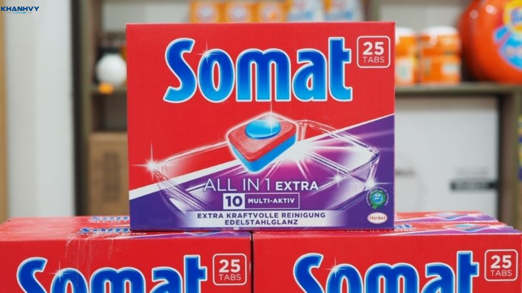 Somat cũng là một cái tên nổi bật đến từ Đức, được biết đến với các viên rửa bát All in 1 có công nghệ enzyme phân hủy vết bẩn cứng đầu như tinh bột, protein và dầu mỡ. Somat không những làm sạch hiệu quả mà còn tích hợp chất làm bóng giúp bát đĩa sau rửa luôn sáng bóng, không để lại cặn và hoạt động tốt trong nhiều điều kiện nhiệt độ khác nhau. Sản phẩm còn có muối làm mềm nước giúp ngăn ngừa cặn vôi bám trên máy và dụng cụ, từ đó bảo vệ độ bền của máy rửa bát. Somat được thiết kế thân thiện môi trường khi không chứa phốt phát và được nhiều gia đình tin dùng tại châu Âu và Việt Nam.