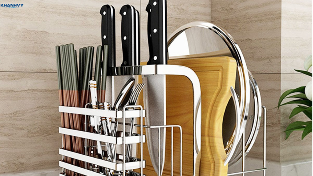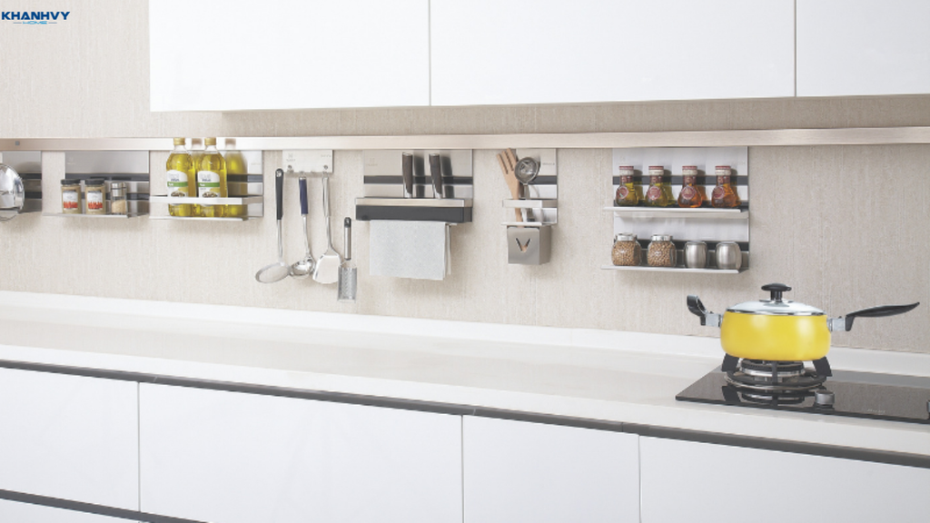 Móc treo và giá treo là giải pháp tối ưu để tiết kiệm diện tích trong các ngăn tủ hoặc trên mặt bàn. Bạn có thể treo dao, thớt, nồi, chảo hoặc các dụng cụ nấu ăn thường dùng khác lên tường hoặc bên trong cánh tủ. Cách lưu trữ này giúp dễ dàng lấy đồ khi cần, đồng thời tạo sự ngăn nắp và tránh làm bếp bị bừa bộn.