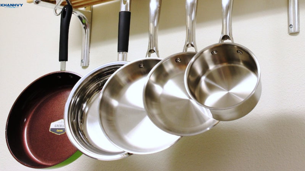 Khu vực nấu nướng có các loại nồi chảo cần thiết