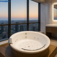 Bồn tắm massage tròn cỡ lớn trong phòng tắm sang trọng với view nhìn ra thành phố