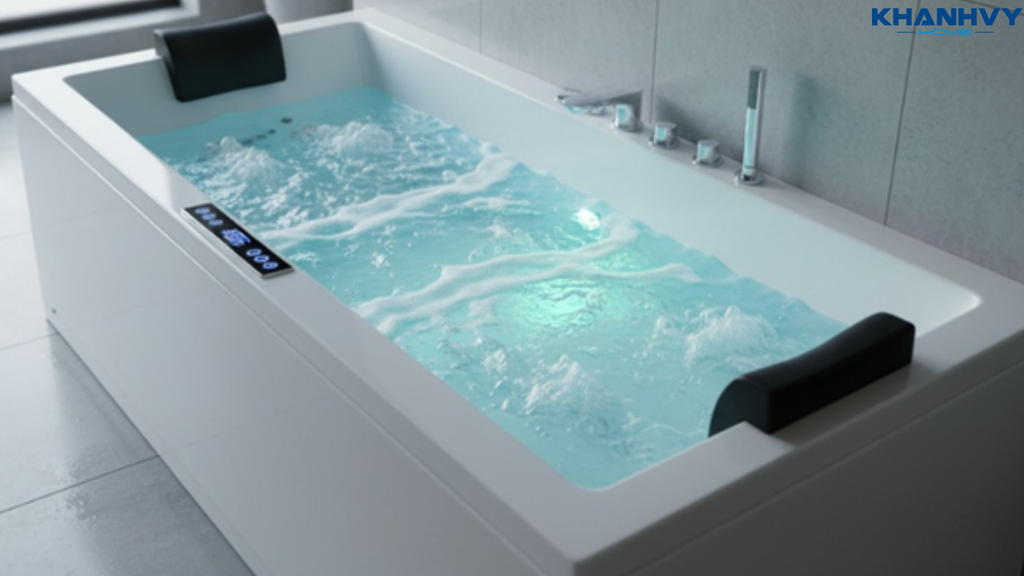 Bồn tắm massage hiện đại, được trang bị bảng điều khiển thông minh và gối tựa đầu