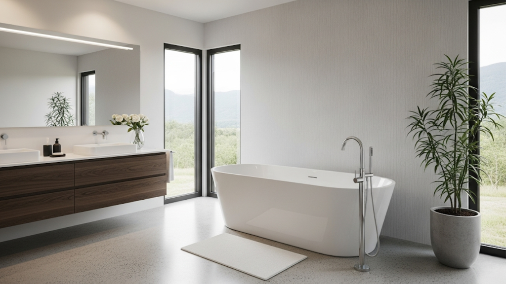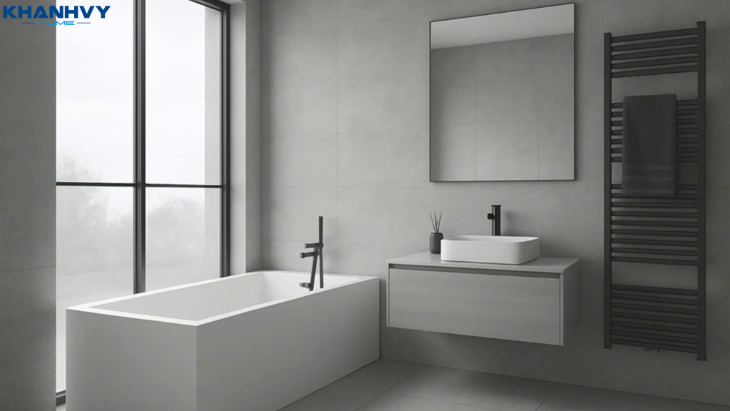 Mẫu bồn tắm chữ nhật trong không gian phòng tắm hiện đại với tông màu xám trắng