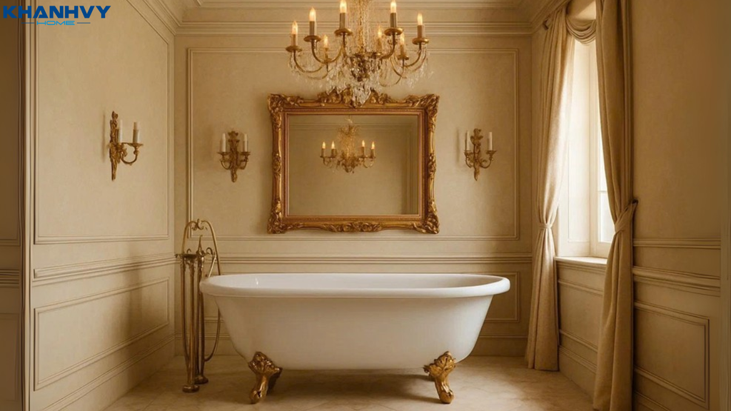 Bồn tắm chân yếm cổ điển là điểm nhấn trong phòng tắm sang trọng với đèn chùm và gương mạ vàng