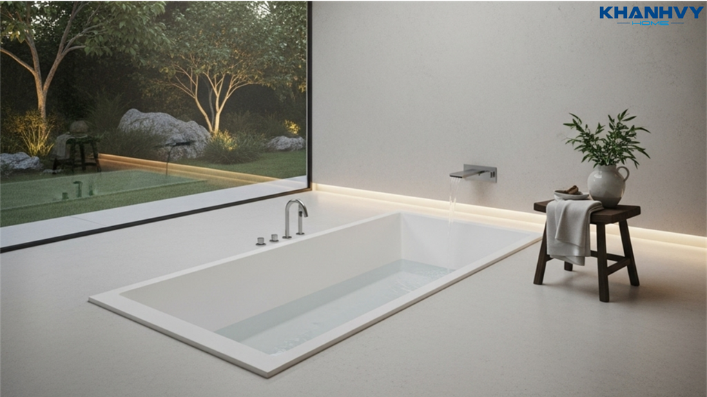 Bồn tắm âm sàn hình chữ nhật với thiết kế tối giản, tạo không gian liền mạch với sàn nhà