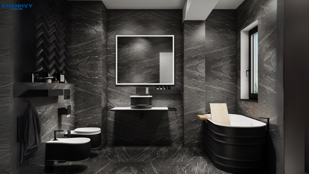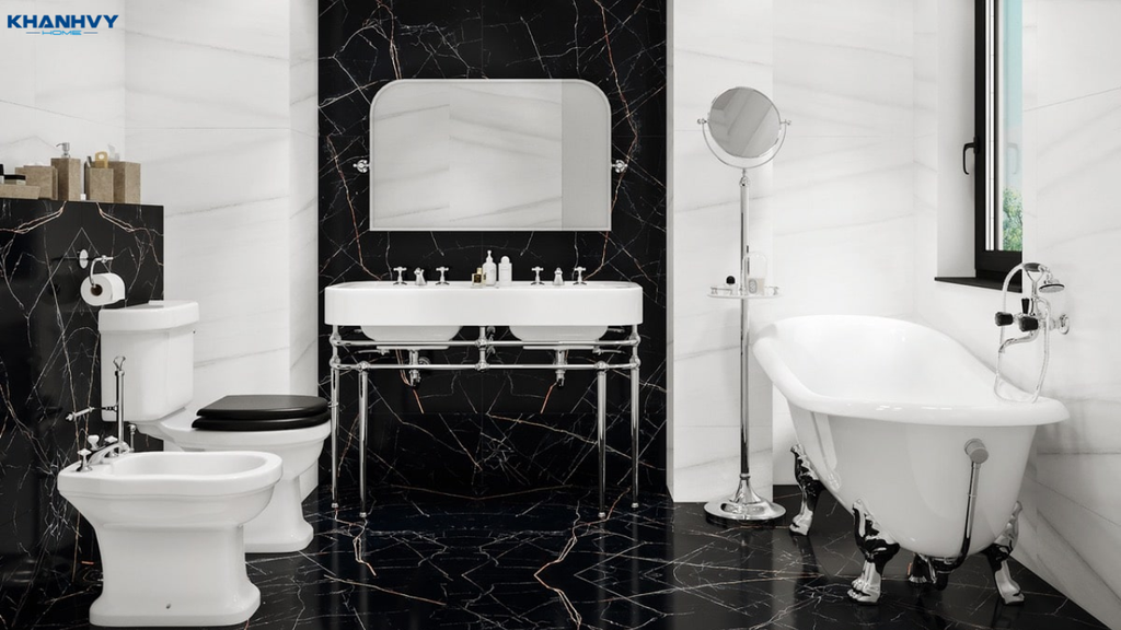 Sự kết hợp kinh điển giữa đen và trắng mang lại nét đẹp tương phản đầy cuốn hút. Tông trắng giữ sự rộng rãi, sáng sủa, còn tông đen nhấn mạnh sự mạnh mẽ, cá tính. Cách phối này phù hợp cho gia chủ yêu thích sự tối giản nhưng vẫn muốn tạo dấu ấn sang trọng. Khi kết hợp cùng đèn LED hoặc gương lớn, phòng tắm sẽ càng nổi bật và ấn tượng.