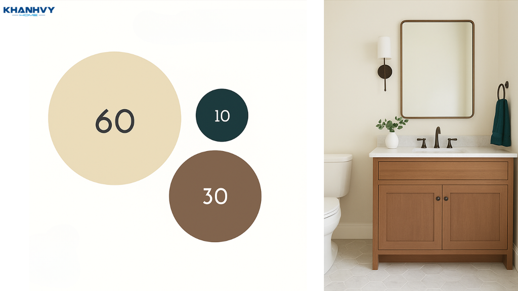Quy tắc 60-30-10 là công thức phối màu được sử dụng rộng rãi trong thiết kế nội thất và đặc biệt hiệu quả khi áp dụng cho phòng tắm. Theo nguyên tắc này: