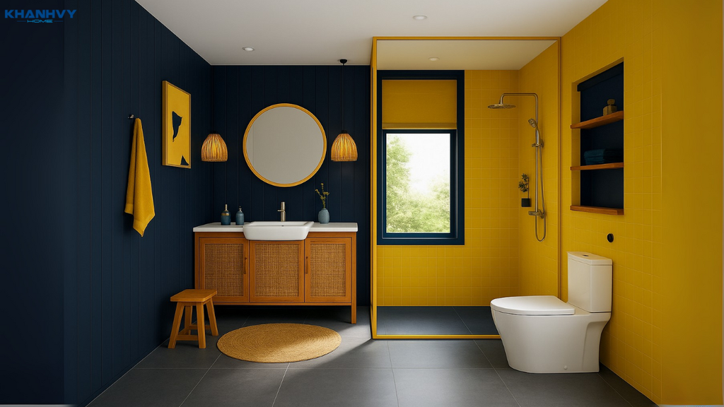 Đây là công thức lý tưởng cho những ai muốn tạo ra không gian nhẹ nhàng, gần gũi nhưng vẫn có sự chuyển sắc tinh tế. Bạn có thể áp dụng bằng cách dùng gạch màu xanh biển cho nền, xanh lá nhạt cho mảng tường và thêm một chút vàng pastel cho phụ kiện trang trí. Sự hòa quyện này giúp phòng tắm vừa tươi mới vừa dễ chịu, đặc biệt phù hợp với gia đình yêu thích phong cách thiên nhiên.