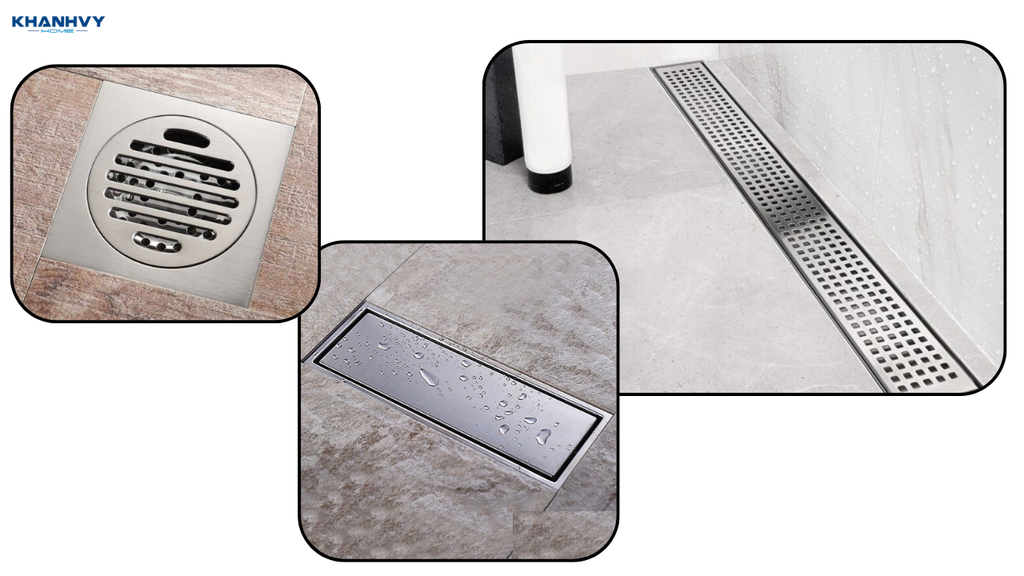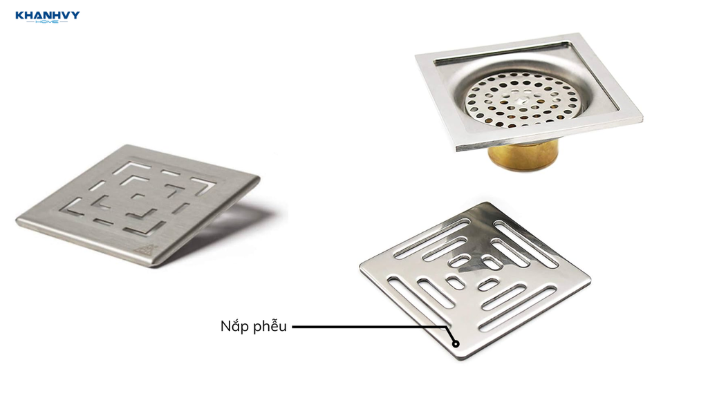 Nắp phễu là bộ phận lộ diện duy nhất trên mặt sàn, có nhiều hình dáng như vuông, tròn, chữ nhật hoặc tam giác để phù hợp với từng vị trí lắp đặt. Bề mặt thường được gia công tỉ mỉ, sáng bóng hoặc phủ họa tiết giả gạch, giả đá để hài hòa với gạch lát. Về chất liệu, inox 304 chống gỉ và hợp kim kẽm bền chắc là lựa chọn phổ biến, ngoài ra còn có dòng nhựa ABS cao cấp nhẹ và dễ lắp đặt.