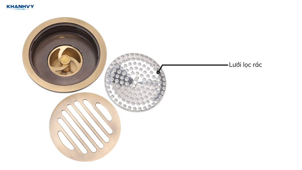 Lưới lọc rác nằm ngay dưới nắp phễu, thường có hình dạng tròn hoặc vuông tương ứng với mặt phễu. Nó được làm từ inox mảnh chống gỉ hoặc nhựa kỹ thuật cứng, có các khe nhỏ đủ để nước đi qua nhưng giữ lại tóc, rác và bụi bẩn. Kích thước nhỏ gọn nhưng đóng vai trò lớnlớn cho hệ thống thoát nước.