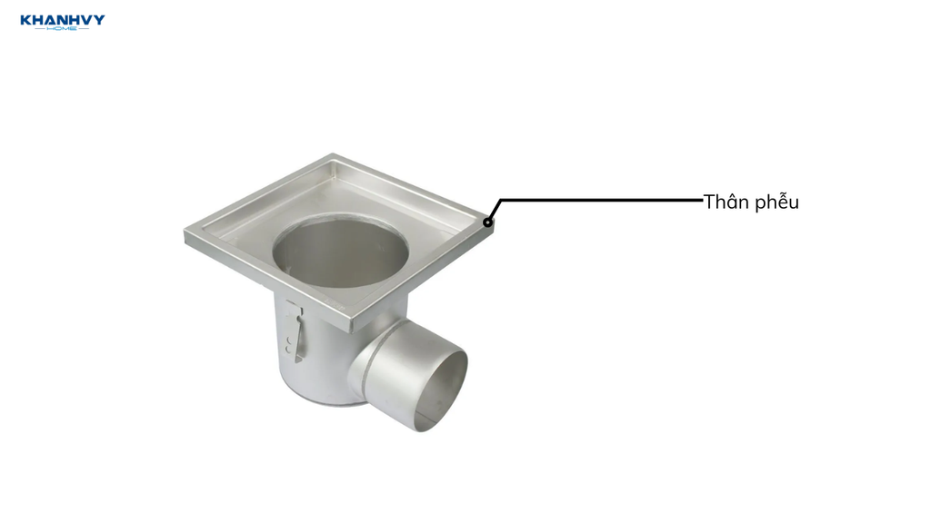 Thân phễu có hình dạng ống rỗng, đặt ẩn dưới mặt sàn, nối trực tiếp giữa nắp và đuôi thoát. Đây là nơi tập trung công nghệ chống mùi, với các loại phao chặn nước, nắp lật hay gioăng cao su ngăn mùi hôi từ đường cống bốc ngược lên. Về chất liệu, thân phễu thường làm từ inox, đồng mạ crom hoặc nhựa kỹ thuật có độ bền cao, chịu được áp lực nước lớn và hóa chất tẩy rửa.