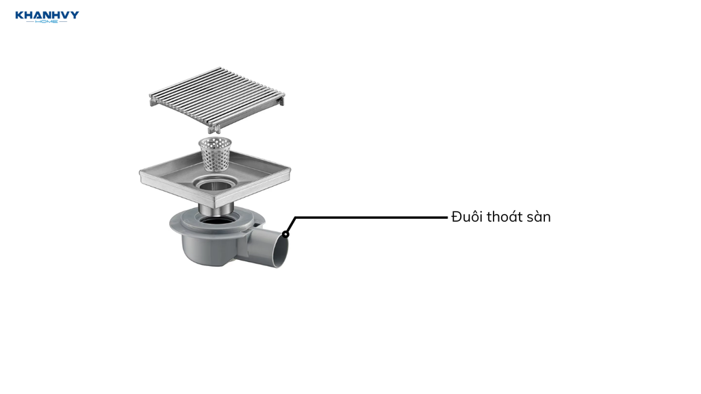 Đuôi thoát nằm sâu nhất, thường có dạng ống tròn với đường kính tiêu chuẩn như phi 60mm, phi 90mm hoặc phi 114mm để đồng bộ với ống thoát nước của công trình. Phần này thường làm bằng inox dày, đồng đúc hoặc nhựa PVC cứng chịu lực, đảm bảo sự kín khít tuyệt đối khi lắp đặt. Đây cũng là bộ phận quyết định tốc độ thoát nước và sự ổn định lâu dài của hệ thống.