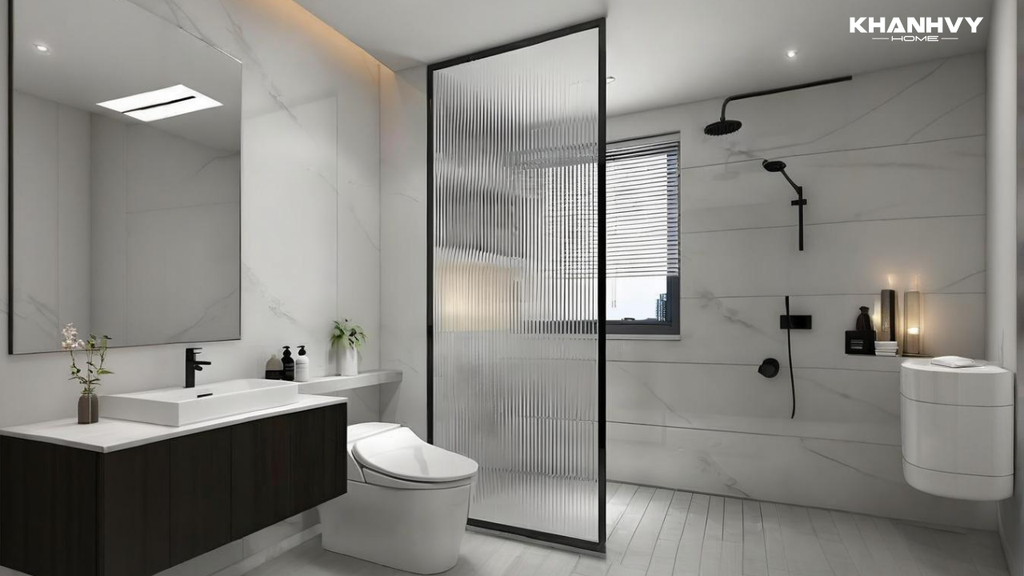 Vách phòng tắm kính mờ hoặc kính dán họa tiết là lựa chọn lý tưởng cho những ai muốn tăng tính riêng tư mà vẫn giữ được sự thoáng sáng cho không gian. Nhờ lớp kính chắn, bạn có thể tắm thoải mái mà không lo bị ảnh hưởng từ các hoạt động khác trong nhà vệ sinh. Đây là giải pháp tiện lợi cho những gia đình đông người hoặc những không gian cần dùng chung.