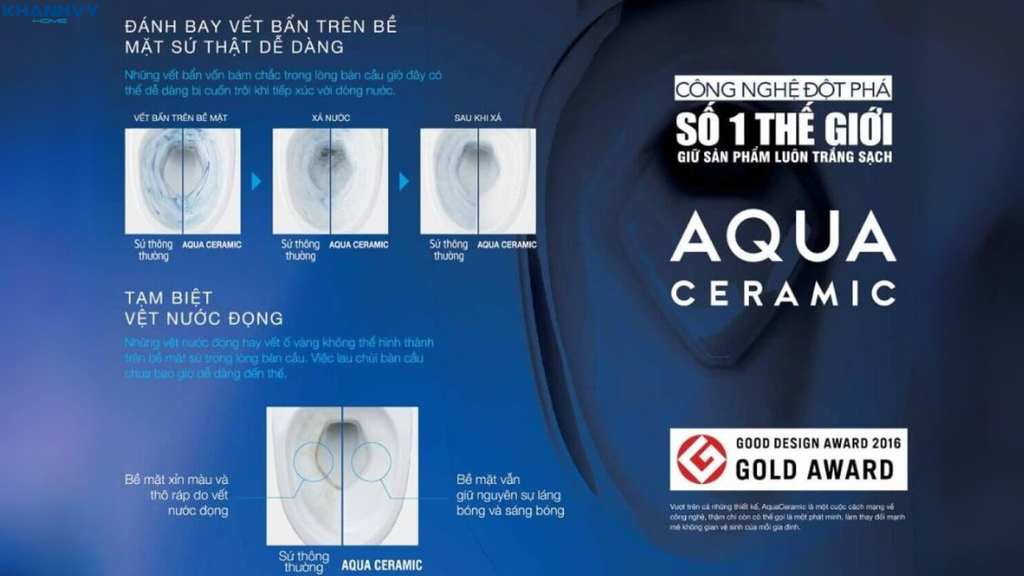 Công nghệ này tạo ra một lớp men sứ có đặc tính siêu ưa nước (hydrophilic). Thay vì để nước đọng lại thành giọt, bề mặt Aqua Ceramic cho phép nước luồn sâu vào giữa bề mặt sứ và vết bẩn, từ đó dễ dàng nâng bổng và rửa trôi mọi thứ chỉ bằng sức nước xả.