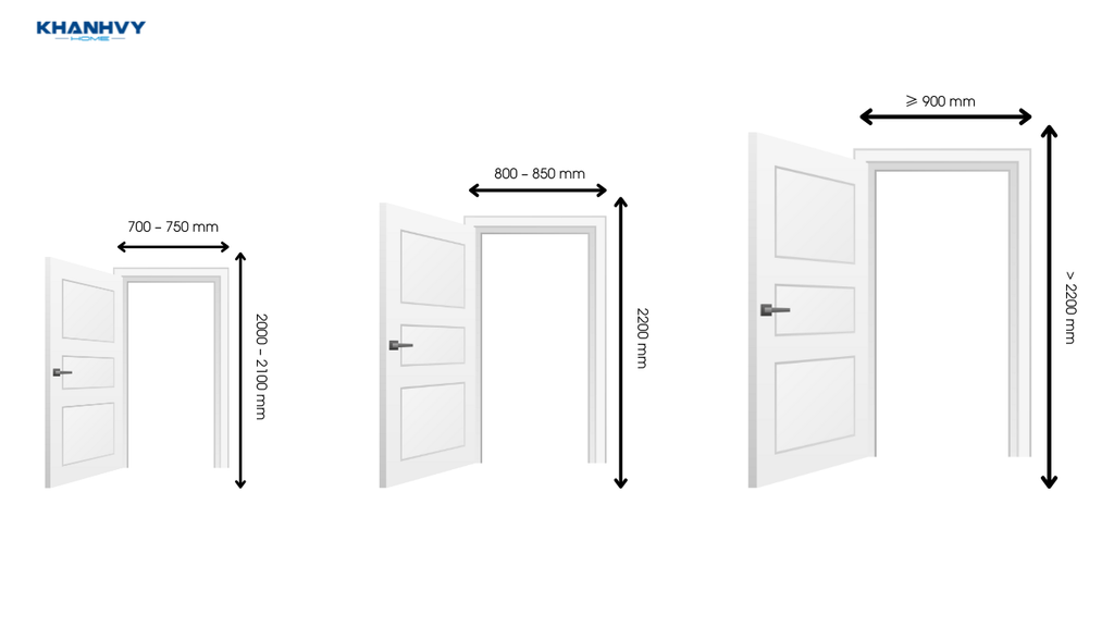 Chiều cao: từ 2100 – 2200 mm, giúp cửa cân xứng với trần cao (2,8 – 3 m) và mang lại vẻ bề thế, hiện đại.