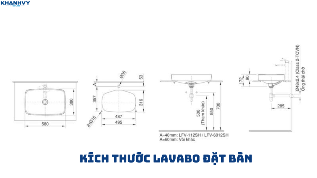 Lavabo dương bàn | 450 - 700 mm | 350 - 500 mm | 100 - 180 mm |