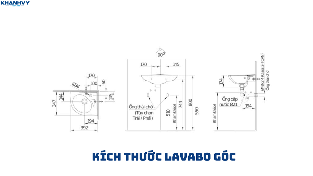 Lavabo góc | 300 - 400 mm (cạnh) | 300 - 400 mm (cạnh) | 120 - 150 mm |