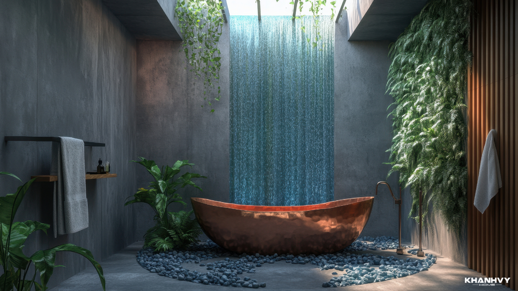 Bên cạnh yếu tố xanh, các chất liệu gạch ốp vân đá, gỗ chống ẩm, đá tự nhiên thường được đưa vào thiết kế để tạo cảm giác mộc mạc nhưng vẫn hiện đại. Bồn tắm đặt cạnh cửa sổ hướng ra vườn, lavabo đặt gần tiểu cảnh hoặc chậu cây nhỏ là những chi tiết thường gặp trong phong cách này. Nhờ sự kết hợp hài hòa giữa thiết kế tinh gọn hiện đại và hơi thở thiên nhiên, mẫu nhà tắm này không chỉ đáp ứng nhu cầu sinh hoạt mà còn trở thành không gian nghỉ dưỡng, giúp tái tạo năng lượng cho cả gia đình.