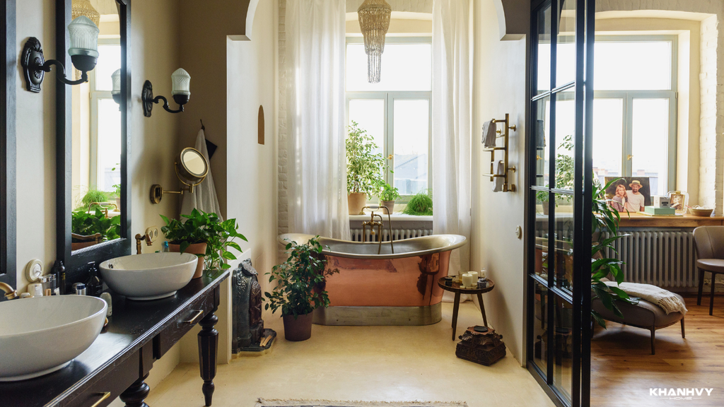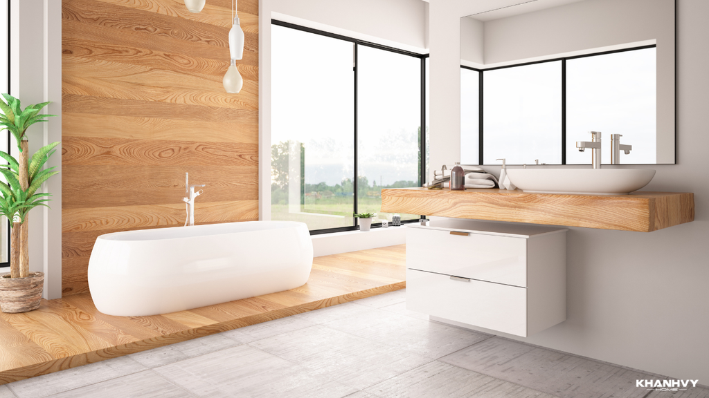 Nhà tắm hiện đại với bồn tắm nằm cạnh cửa sổ lớn, ánh sáng tự nhiên tràn ngập
