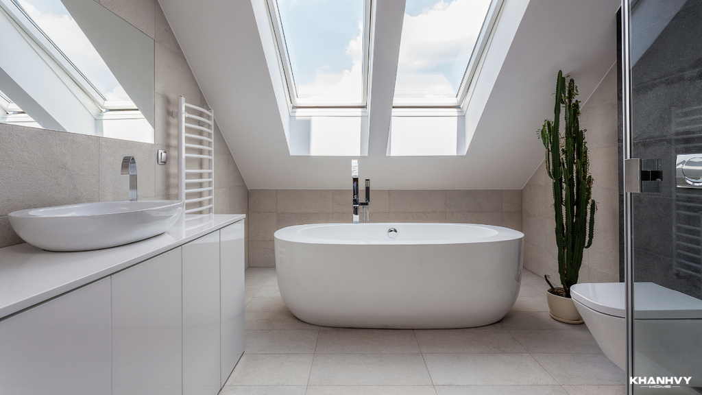 Phòng tắm tông trắng sáng, bồn tắm nằm tối giản tạo cảm giác rộng rãi